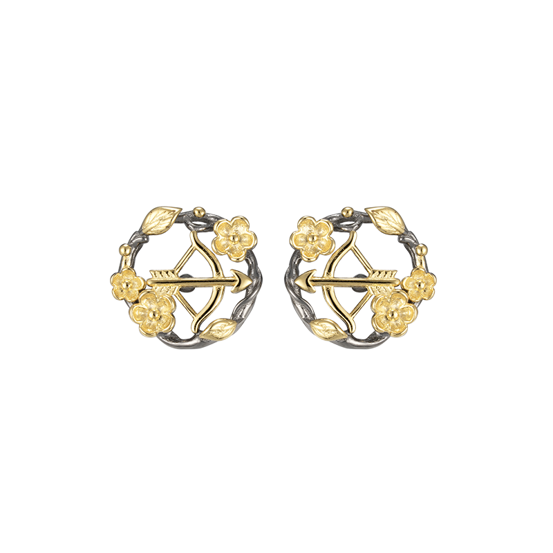Smukke Skytte stjernetegn øreringe i mørkt oxideret sølv med elegante guldbelagte detaljer. Den mørke overflade giver smykket et dybere og mere markant udtryk, mens de gyldne elementer fremhæver det fine stjernetegnsmotiv. Øreringene er dansk designet og udført med flotte detaljer, som giver et stilfuldt og tidløst look.
