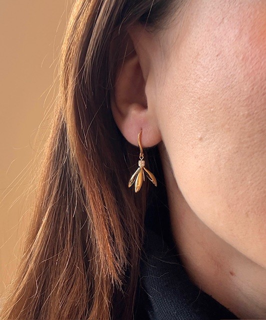 Flotte enkle vintergæk øreringe fra Designers Favorites, øreringene er 3 cm lange og med krog bag på. De fine vintergæk øreringe er i ægte sølv med 18 k guldbelægning og hvide cz sten. Leveres i fin smykkeæske fra Designers Favorites.